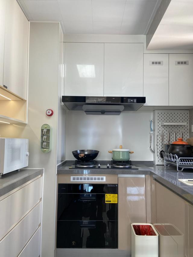 在厨房的一侧,微波炉、烤箱,都在安置在合理的区域,为烹饪提供了更多便捷性。橱柜上整齐有序的厨具餐具,既实用又美观。