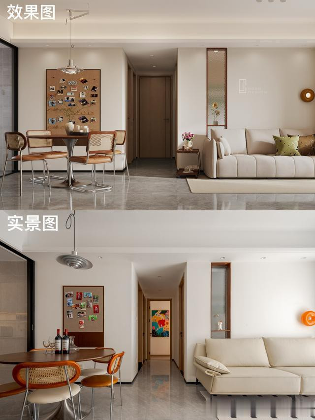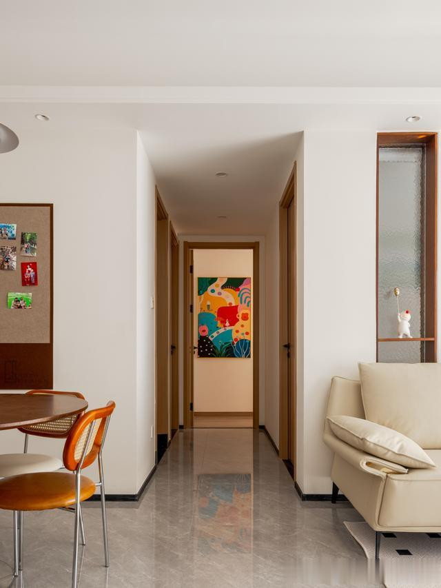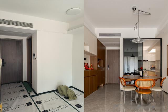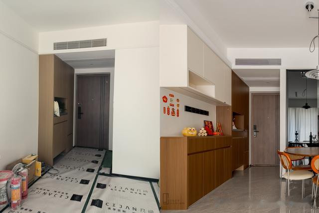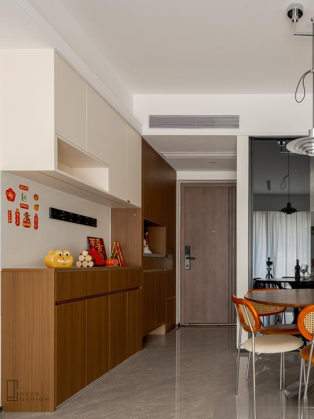 入户鞋柜原门板颜色与中古风格不符,更换为胡桃木色后与全屋风格融合,提升美观度。鞋柜位于门口,作为室内外过渡空间,合理布局提供缓冲和准备区域,方便日常活动,增强家居实用性和舒适度。