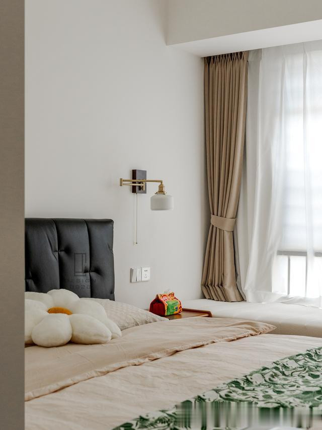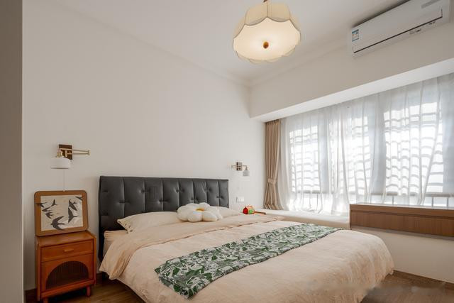 黑色床头板与白色墙壁、绿色被子相互衬托,增强层次感的同时不失和谐。壁灯增添温馨感。木质床头柜兼具质感与实用性,提供储物空间。可以在上面摆手机等小物品,既实用又美观。窗帘与墙壁色彩相近,保持整体空间统一,兼顾保护个人隐私。