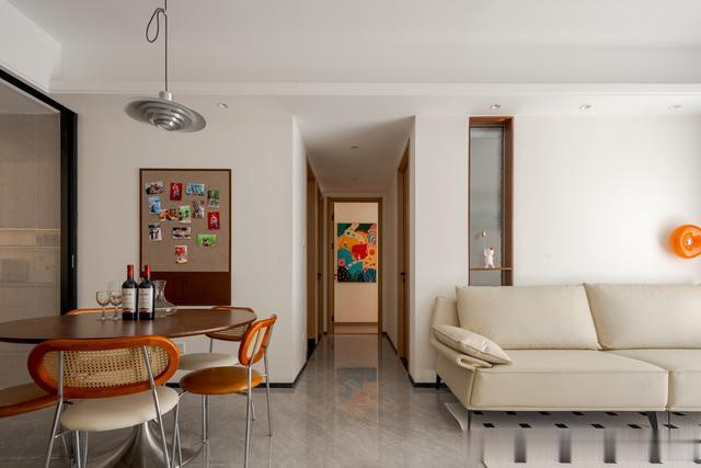 餐厅中央,圆形餐桌摆放在中央,中古藤椅橙白交替,为整个空间增添了一抹活泼的色彩。银色的摇臂吊灯悬挂在桌子上方,可以跟随餐桌调整位置,为用餐时光投下柔和温馨的光影。