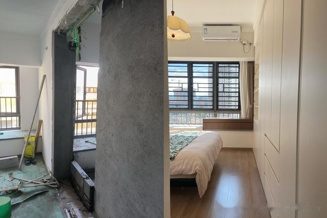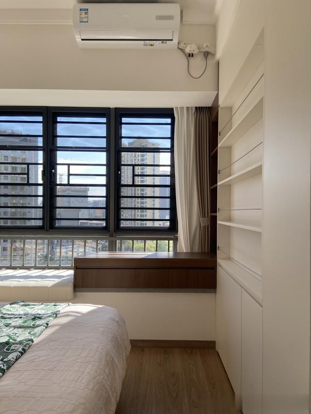 下铺利用飘窗的位置,设计成了一个1.35米乘以1.9米的榻榻米,而上铺则巧妙地避开了飘窗的位置,做成了一个1.1米乘以2米的床铺。在上铺的吊顶处隐藏了空调挂机,既美观又实用,同时形成上铺独立的小空间。