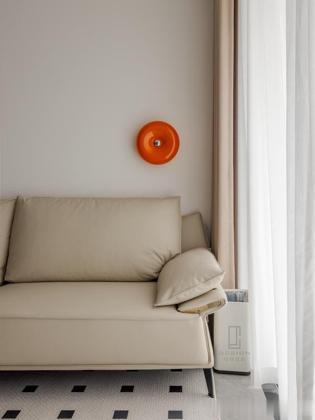 客厅摒弃常规的茶几,可以搭配灵活移动的小推车。这样就让空间更加开阔,更为孩子们在客厅玩耍提供了便利,增加了亲子时光乐趣。橘黄色的甜甜圈壁灯散发着暖意,它不仅是阅读的照明工具,更是空间中一件不可多得的装饰品,为生活增添了一抹温馨与浪漫。