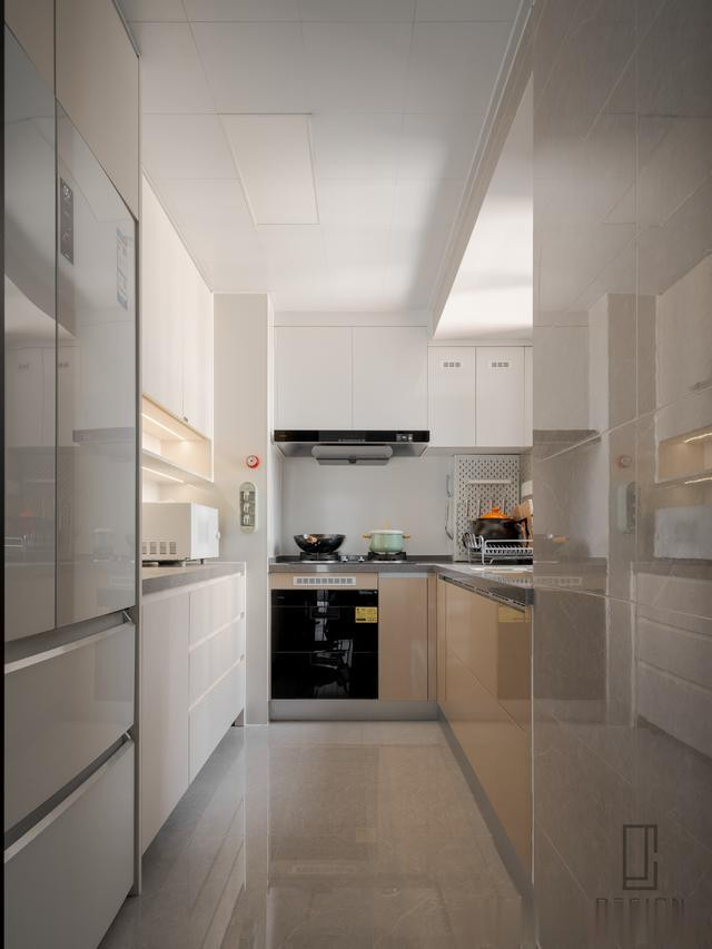 厨房以白色和灰色为主色调,原本L型的橱柜被巧妙地扩展为U型,极大地增加了操作台面和储物空间。新砌的墙面并没有采用传统的贴砖方式,而是与原本的灰色墙砖一起,采用了珐琅板饰面。这种设计不仅美观大方,还能遮盖瑕疵,打理起来也极为方便。