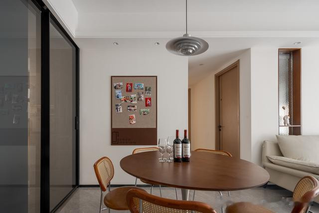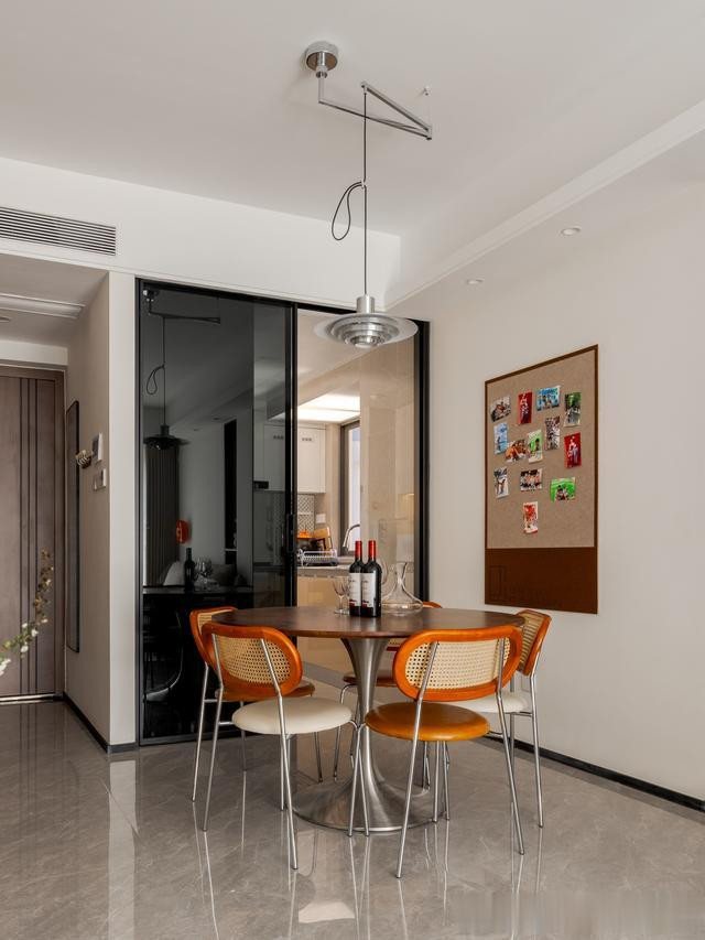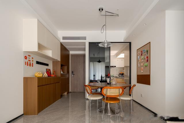 原本,餐厅背靠两堵墙,餐厨空间不够通透。经过改造,餐厨间的隔墙被打开,采用黑色玻璃推拉门,巧妙地划分了空间,既保持了空间的通透性。让厨房与餐厅之间的活动动线更加流畅,更使得客厅的光线能够直接引入厨房,整个空间因此变得更加明亮与通透。